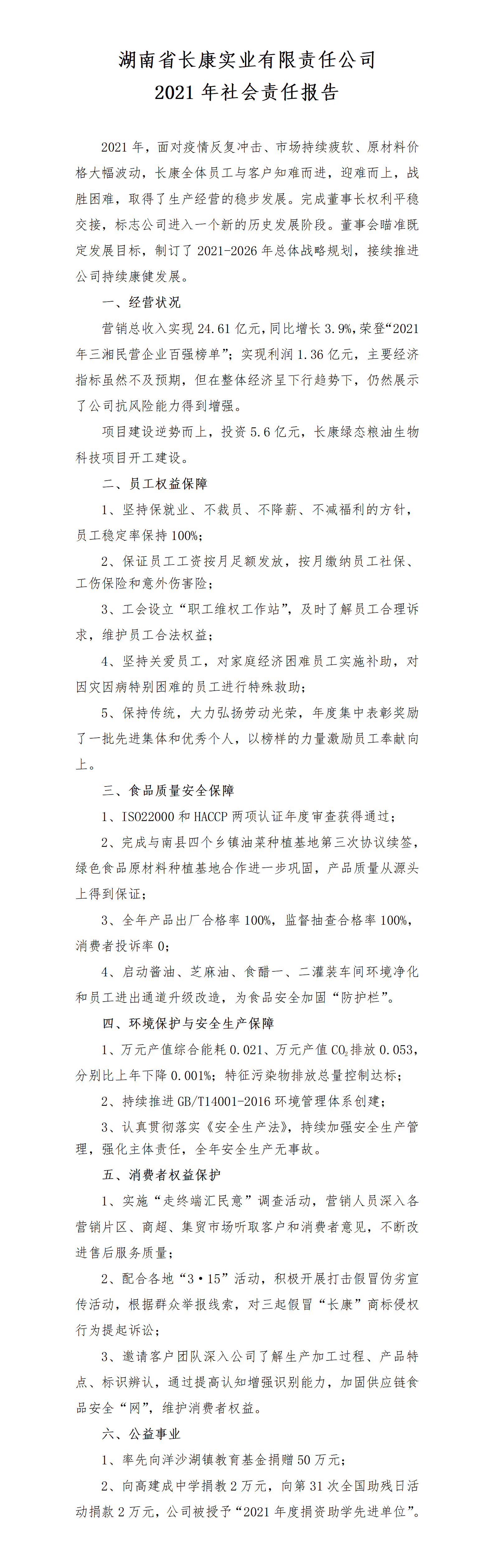 湖南省長康實業有限責任公司2021年社會責任報告