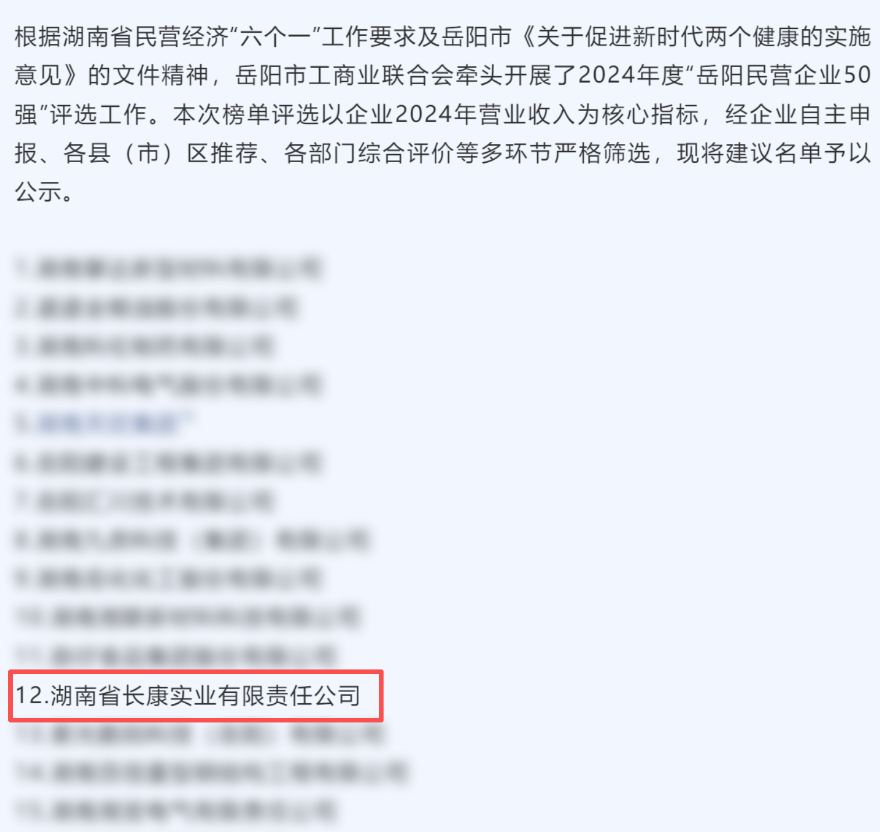 近日,岳陽市工商業聯合會發布《2024年度“岳陽民營企業50強”建議名單的公示》,湖南省長康實業有限責任公司赫然在列,用硬核實力斬獲這份城市級榮譽。